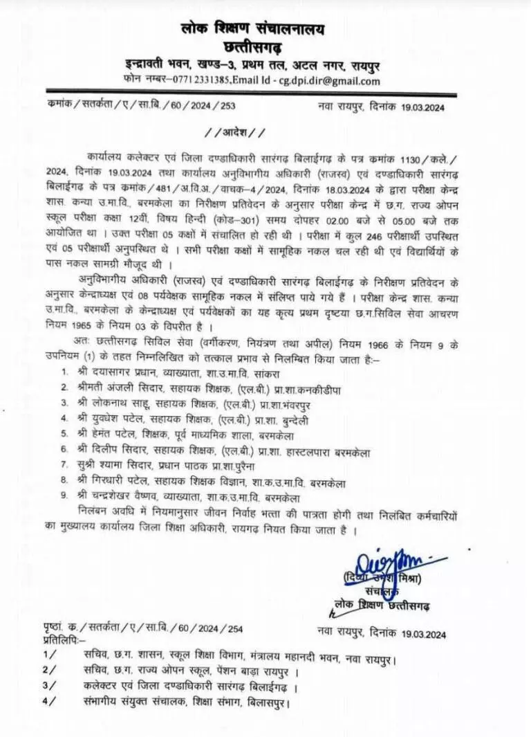 रायपुर/सारंगढ़/बिलाईगढ़। ओपन स्कूल के हिन्दी विषय की परीक्षा में सामूहिक नकल के मामले में 9 शिक्षकों को निलंबित किया गया है. एसडीएम के जांच प्रतिवेदन के आधार पर डीपीआई द्वारा की गई कार्रवाई से विभाग में हड़कंप मचा हुआ है. सामूहिक नकल प्रकरण पर जिन शिक्षकों को निलंबित किया गया है, उनमें दयासागर प्रधान, व्याख्याता,